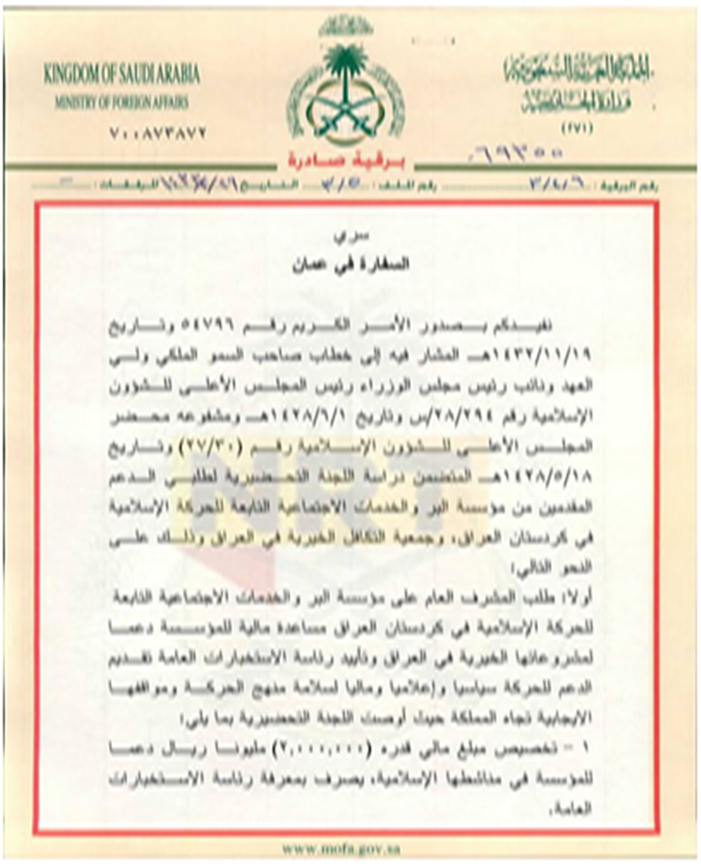 بە گوێرەی بەڵگەنامەیەکی ویکیلیکس کە تیایدا بروسکەیەکی نهێنی وەزارەتی دەرەوەی عەرەبستانی سعودی بڵاو کردوەتەوە، کە بە ڕوونی ژمارە و بەروارەکانی ئاشکرایە و مێژووەکەی دەگەڕێتەوە بۆ ٢٤ کانونی دووەمی ٢٠١٢، تیادا باڵیۆزخانەی سعودیە لە عەمانی پایتەتی ئوردن ئاماژەی کردووە، بە فەرمان و ڕاسپاردە جێنشینی پادشای سعودیە و سەرۆکی ئەنجوومەنی وەزیران و سەرۆکی ئەنجوومەنی باڵای کاروباری ئیسلامی، بۆ پشکەشکردنی کۆمەک بە دامەزراوەی(بیڕ-البر) و خزمەتگوزاری سەر بە بزوتنەوەی ئیسلامی لە کوردستان و کۆمەڵەی (تەکافولی خەیری) لە عێراق.