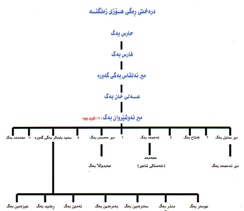 ئهو (بابهكر بهگی گهورهی كوڕی نهوشێروان بهگی كوڕی عهلی خان بهگی كوڕی ئهلقاس بهگی گهورهی كوڕی فارس بهگی كوڕی حارس بهگی زهنگنه) یه و به (سهیید بابهكر ئاغای گهوره) ناسراوه و نازناوی (سهیید) له ڕوانگهی ئهوهوه پێ وتراوه دایكی له شێخانی (سورداش) بووه.