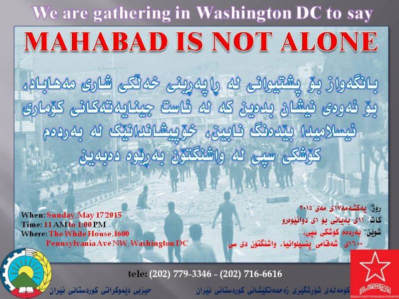 کۆمیتەکانی حیزبی دیمۆکراتی کوردستانی ئێران و کۆمەلەی شۆرشگێری زە حمەتکێشانی کوردستانی ئێران لە ئامریکا هەلدە ستن بە ساز دانی خۆپێشاندانێک لە رۆژی یەک شەممە رێکەتی ١٧ی مەی ٢٠١٥ کاتژمێر ١١ی بەیانی هەتا ١ی پاش نیوەرۆ لە پێش دەرگای کۆشکی سپی ئامریکا لە واشینگتۆن پێتەختی ولاتە یەک گرتۆکانی ئامریکا بۆ پشتیوانی لە خەلکی راپەریوی کوردستان بە گشتی و بە تایبەت خەلکی مهاباد . بەشداریتان لە خۆپێشاندانە دەبیتە دلگەرمی خەلکی رۆژهەلاتی کوردستان و هەروەها بەجێ گەیاندنی ئەرکی نەتەوەیمان. کۆمیتەکانی حیزبی دیمۆکراتی کوردستانی ئێران و کۆمەلەی شۆرشگێری زەحمەتکێشانی کوردستانی ئێران لە ئامریکا داوا لە گشت خەلکی بەشەرەفی کوردی دانیشتووی دەڤەری واشینگتۆن دەکا بە بەشداریتان لەم رۆژە گرینگە دا پشتیوانی خۆتان لە گەلی کۆرد لە رۆژهەلاتی کوردستان را بگەیەنن.