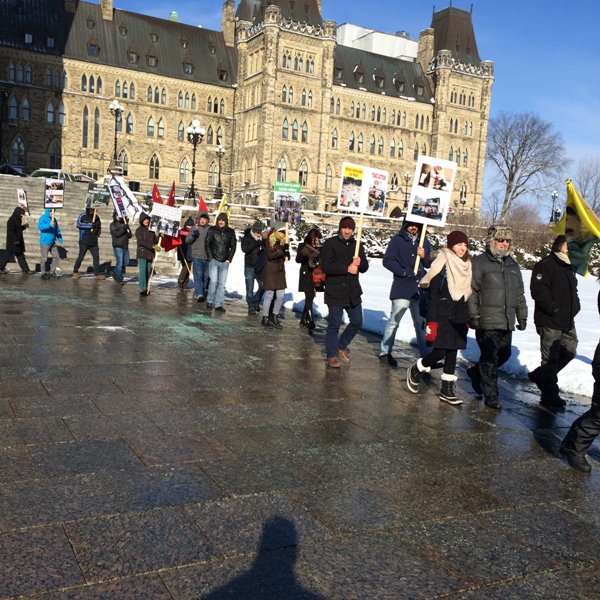 بەوبۆنەوە لە ١٨ی جەنیوەری ٢٠١٦ ئازادیخوازن وکۆمۆنیستەکان خۆپیشاندانێکی گەورەیان سازدا. سەرەڕای ساردی کەش وهەوای لەڕادەبەدەر کەپلەی گەرما ٢١پلە لەژێر سفرەوە بوو، بەڵام پتر لە٤٠٠ لەتینوانی ئازادی وئاشتی لەبەردەم پەرلەمانی کەنەدا، بۆماوەی پتر لە٢کاتژمێر گردبوونەوەیان ئەنجام دا. شایانی باسە ئازادیخوازان لەشارەدوورەکانی دیکەی کەنەدا، وەک تۆرنتۆ ومۆنتریال ئامادەییان هەبوو. هەروەها ڕێکخراو وپارتی چەپ وکۆمۆنیستی کەنەداییش بەشداریانکرد. ئەندام وهەوادارانی پارتەکۆمۆنیستەکانی ئێران وتورکیا بەشێوەیەکی بەرچاو ئامادەبوون.