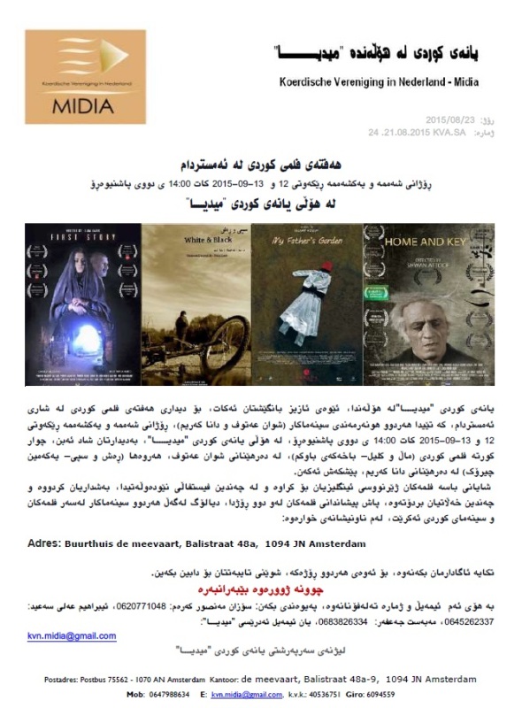 ههفتهی فلمی کوردی له ئهمستردام ڕۆژانی شهممه و یهکشهممه ڕێکهوتی 12 و 13-09-2015 کات 14:00 ی دووی پاشنیوهڕۆ له هۆڵی یانهی کوردی "میدیــــا"