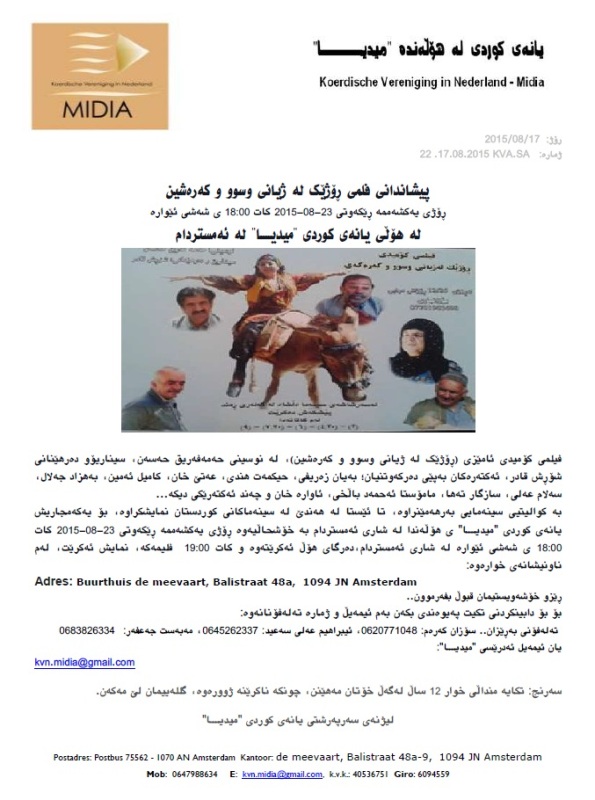 به کوالیتیی سینهمایی بهرههمێنراوه، تا ئێستا له ههندێ له سینهماکانی کوردستان نمایشکراوه، بۆ یهکهمجاریش یانهی کوردی "میدیـــا" ی هۆڵهندا له شاری ئهمستردام به خۆشحاڵیهوه ڕۆژی یهکشهممه ڕێکهوتی 23-08-2015 کات 18:00 ی شهشی ئێواره له شاری ئهمستردام، دهرگای هۆڵ ئهکرێتهوه و کات 19:00 فلیمهکه، نمایش ئهکرێت، لهم ناونیشانهی خوارهوه: