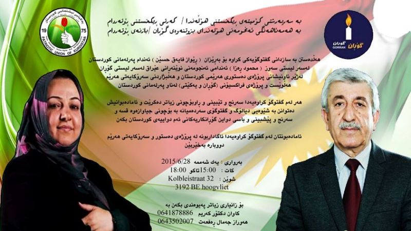 کۆمیتەی ڕیکخستنی هۆڵەندا/کەرتی ڕێکخستنی رۆتەردام بە هەمائاهەنگی ئەنجومەنی هۆڵەندای بزوتنەوەی گۆڕان /بازنەی ڕۆتەردام هەڵدەستن بە سازدانی گفتۆگۆیەکی کراوەبۆ بەڕێزان (ڕێواز فایەق حسین)ئەندام پەرلەمانی کوردستان لە سەر لیستی سەوز (محمود ڕەزا) ئەندامی ئەنجومەنی نوێنەرانی عێراق لە سەر لیستی گۆڕان لە ژێر ناونیشانی پڕۆژەی هەرێمی دەستوری کوردستان وهەڵبژاردنی سەرۆکایەتی هەرێم هەڵوێست وپڕۆژەی فراکسیۆنی (گۆڕان ویەکێتی ) لە ناو پەرلەمانی کوردستان .