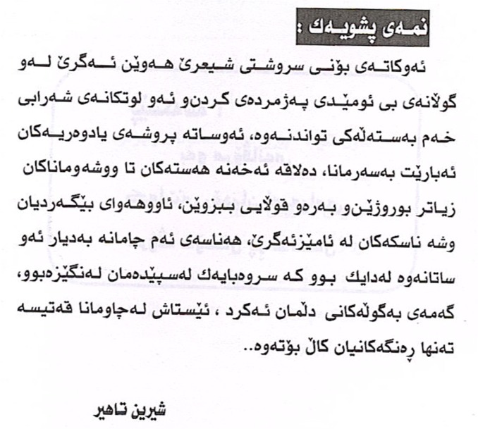 (خورةي دةنطي زام) و ضةندين شيعري ناسكي تر ئةو شيعرانةن لة دوتوصي كتصبصكي جواني شيعري دا كة كة طةلآيةيةكي زةردي ثايزة لة ناو رةشي بةرطةكةدا لةذصر ناوي (ثيرؤزةيةك بة طؤناي ثايزةوة) دةدرةوشصتةوة. ئةم شيعرانة بة خامةي ناسكي شيرين تاهير ضاويان بةدنيا هةلَهصاناوة. شيرين تاهير لة دايك بووي شاري سلصماني يةو دةرضووي 1988 - 11989 ي ثةيمانطاي مامؤستاياني بةشي عةرةبية لة شاري هةولصر، هةر لة كاتي تةواوبووني ثةيمانطاوة، لةطةلصك لة ئؤردوطا زؤرةملصكاندا، كة رذصمي طؤرِبةطؤرِ بؤ كوردي دانابوو، وةك مامؤستايةك خزمةتي مندالآني كوردي كردووة و بةبي وةستان تاكو ئصستاش سةرةراي ثصكهصناني ذياني تايبةتي هةروةك مامؤستايةك بةردةوامة لةكاركردندا... كوردستان نصت