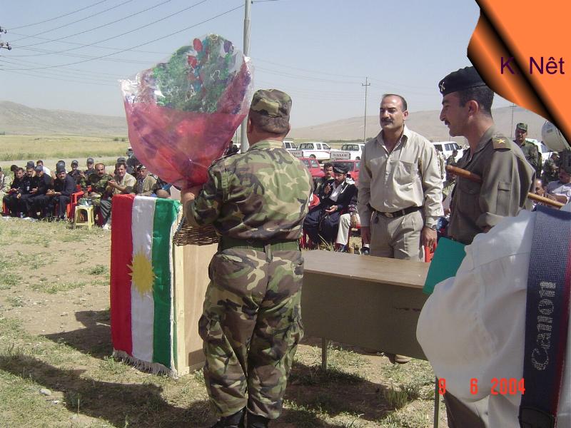 ئةمأؤ 9-6-2004 لة يةكصك لة سةربازطةكاني ناوضةي بازياني سلصماني هصزي ثصشمةرطةي كوردستاني سةر بةيةكصتي نيشتماني كوردستان، ئاهةنطي كؤتايهصنان بة خولصك ئةفسةري هات، كةتيايدا زياد لة 90 ئةفسةري كورد و ضةند ئةفسةرصكي توركمان و عةرةب و ئاشوري، بةشداريان تيادا كردبوو. ئةم ئةفسةرة تازانة لصثرساوصتي ثاراستني بيرةنةوتةكاني كةركوكيان ثصدةسثصردرصت. لة مةراسيمةكةدا جصطري سةرؤكي هصزي ثصشمةرطةي كوردستاني سةر بةيةكصتي، بةرصز كاك جةعفةر و ذمارةيةك لة بةرثرساني سياسي و سةربازي ئامادةبوون، وة هةروةها لةلايةن بةريتانيةكانةوة كة ئةو ئةركةيان ثصسثصردراوة، ضةند بةرثرسصكي سةربازييان ئامادةبوون. ئةوةي شايةني ووتنة، ئةفسةرة دةرضووةكان لةكاتي نمايشكردني هةندص لة كارة سةربازييةكانياندا، (شعاري) كوردستان يان نةمانيان دةطوتةوة. وةهةروةها ثصشكةشكةري مةراسيمةكة ضةند هؤنراوةيةكي نيشتماني خويندةوة. طةلان هةموو براي منن ... هةر زؤردارانم دوذمنن ... داواي ولآتي كةس ناكةم ... ثةنجة بؤ مافي كةس نابةم .... بؤ مافي طةل و خاكةكةم .... هةتاماوم خةبات دةكةم ...... داطيركةري دلَ ثأ لة قين ....