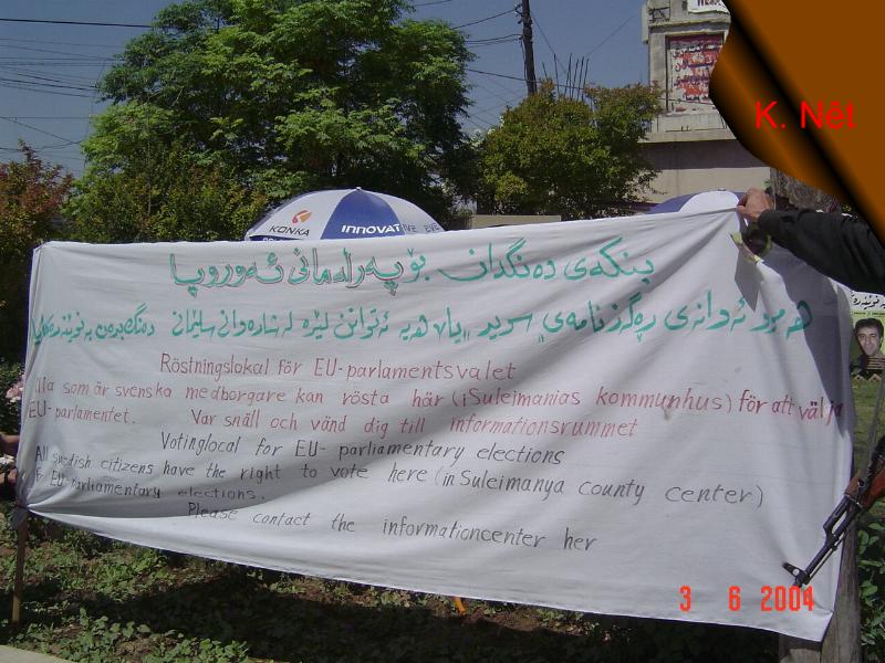 بةهةم ئاهةننطي لة نصوان حكومةتي سويدي و شارةواني سلصمانيدا، بؤ هةلَبذاردني ئةنداماني ثةرلةماني ئةوروثا، هةموو ئةو كوردانةي كة أةطةزنامةي سويديان هةيةو ئصستا لة كوردستانن دةتوانن لة شارةواني سلصماني دةنطي خؤيان بدةن. هةر بةوبؤنةيةشةوة بةرَصز (جةبار ئةمين) ثالَوراوي ثارتي سةوزي سويدي بؤ ثةرلةماني ئةوروثا، ثروثاطةندةي خؤشي لةسلصماني داناوة. هيواي سةركةوتن بؤ كاكة جةبار دةخوازين، و ئومصدةوارين كة هةموو كوردةكاني سويد دةنطي بدةنص...... كوردستان نصت