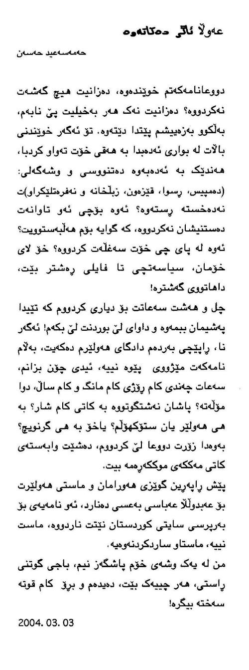 بؤ بينيني ئةو نووسينةي كصشةي لة نصوان بةرصزان كاك عةبدولَلآ ئاطرين و كاك حةمةسةعيد دروستكردووة ئصرة كليك بكة