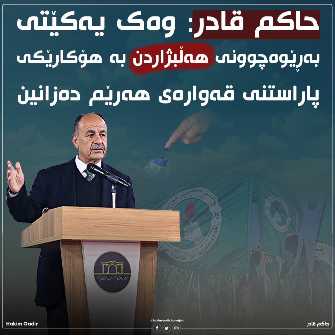 حاکم قادر وەک هەمیشە جەخت لە یەکڕیزی و یەکگرتووی لایەنە سیاسییەکان و گەلی كوردستان دەکاتەوە و دەڵێت، قۆناغەكە وا دەخوازێت سەرجەم لایەنە سیاسیە كوردستانیەكان و گەلی كوردستان یەكگرتو و یەكریزبن تا زامنی سەركەوتنمان بكەین دژ بە ھەموو پیلانێكی دوژمنكارانە كە دژی نەتەوەكەمان ئەنجام دەدرێت، ھەروەھا پێویستە ململانێكان وەلابنێن و خۆیان بە دووربگرن لە ھەموو جۆرە تەخوێنێك لە سوشیاڵمیدیا و تیڤییەكان و لەبری ئەوە پێویستە بە زوترین كات كۆببنەوە و بگەنە ڕێكەوتن لەسەر پاكێجێكی ھاوبەشی نیشتیمانی و ستراتیژی، تا ڕووبەڕووی ھەموو ئەو ئالنگاریانە ببنەوە كە لە ئێستا و لە داھاتوودا ڕوودەدەن، تا بەرژەوەندییە باڵاکانی میللەتەکەمان پارێزراو بێت.