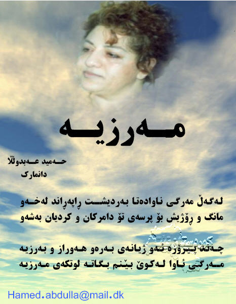 - وهفاداری یهك بۆ گیانی پاك و نهمری"مهرزی"خانم مهرگی له ناكاوی ئهم هونهرمهنده له یانهی كوردی "میدیـــا" له هۆڵهنده بهرز و پیرۆز ڕاگیرا.
