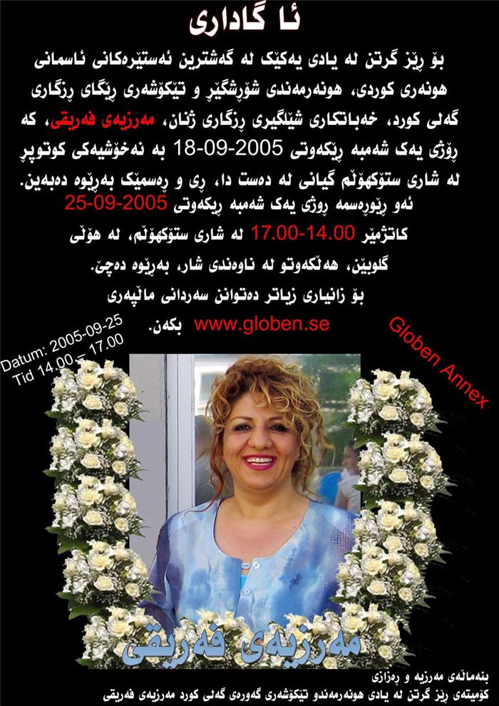 ئهمڕۆ 18-9-2005 کاتژمێری 11 ی سهرلهبهیانی به کاتی ناوهندی ئهوروپا، دڵه گهورهکهی هونهرمهندی بهناوبانگی کورد، خانم (مهرزییه فهریقی) هاوسهری هونهرمهند (ناسری ڕهزازی) له یهکێک له نهخۆشخانهکانی ستۆکهۆڵم، له لێدان کهوت. ئێمه وهک کوردستان نێت پرسه و سهرهخۆشی خۆمان به بنهماڵه و هاوڕێیان و ههموو هونهرمهندانی کورد، ڕادهگهیهنین. کۆچی دوایی داده مهرزییه، زیانێکی گهوره بوو له هونهری مۆسیقا و گۆرانی کوردی. . . . کوردستان نێت.