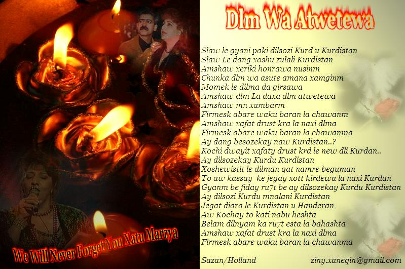- سڵاوی گهرمی دڵی پڕ هومێدی ئێمهت پێشكهش، كهڵه ژنی كوردستان ئهی مهرزیهی مهزن و میهرهبان و نهمر. . ڤینۆس فایهق