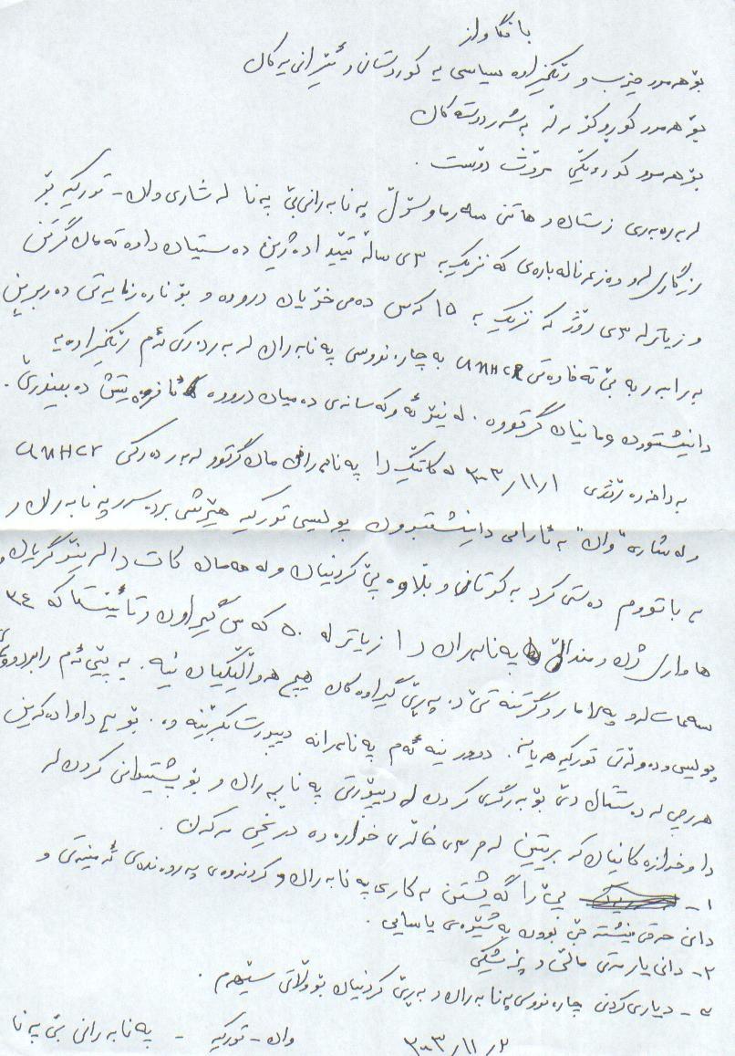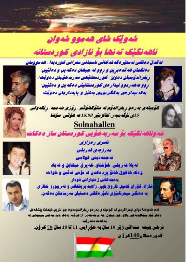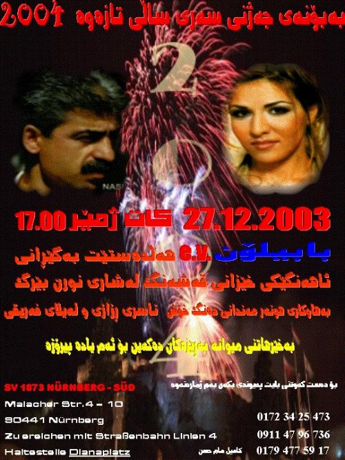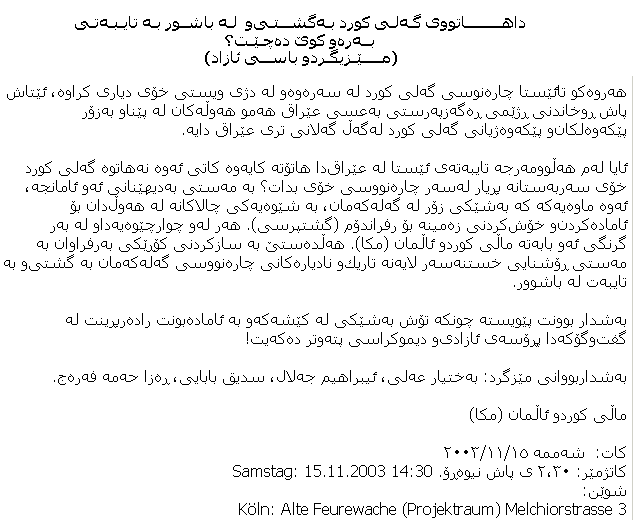 | بهگوێرهی ههوالێك كه رۆژنامهی (جهماوهر) بڵاویكردۆتهوه، بهرێز قادر عهزیز سكرتێری گشتی حیزبی زهحمهتكێشانی كوردستان، لهنێوان شوێنی حهوانهوهیهوه و فرۆكهخانه، له ئوردن چارهنووسی نادیاره، و كهس نازانێ چی بهسهرهاتووه. ئێمهش وهك كوردستان نێت كهوتینه سۆراغی ئهو مهسهلهیه و توانیمان زانیاری بهدهست بهێنین كه بهرێز عهزیز خۆشبهختانه سهلامهته و ئێستا له شاری لهندهنه. . . كوردستان نێت. . 4-11-2003 |