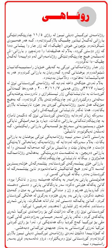 | رۆژی 7-11-2003 لهنووسینێكیی كورتدا وهك كوردستان نێت، نارهزایی خۆمان بهرامبهر ئهو لێدوانانهی بارزانی دهربڕیبوو، كهلهرۆژنامهی (دهیلی نیوز) ی توركی له رۆژی 5-11-2003 دا بڵاوكرابۆوه، و رۆژنامهی كوردستانی نوێ، وهریگێڕابووه سهر زمانی كوردی و بڵاوی كردبۆوه. جێگای شانازییه، كه پارتی دیموكراتی كوردستان، به رونكردنهوهیهكی بوێرانه، لهڕێگای رۆژنامهی (خهبات) زمانحالی خۆی، ناوهرۆكی ئهو لێدوانهی رهدكردهوه و رایگهیاند ئهوهی دهیلی نیوز بڵاویكردۆتهوه، درۆ و دهلهسهیه و زۆر دووره لهڕاستیهوه، بۆیه ئێمهش به سنگێكی فراوانهوه داوای لێبوردن له بارزانی و پارتی دیموكراتی كوردستان دهكهین كه بهنارهوا، لهسهر ئهو بابهته نارهزایمان بهرامبهریان دهربڕیوه و تهنانهت راپرسیشمان لهسهر بڵاوكردهوه. دهربارهی ئهو نارهزاییهشمان بهرامبهر تاڵهبانی، ئاواته خوازین تاڵهبانی و یهكێتی نیشتمانیش ئهگهر وانیه بوێرانه رۆژنامهی (جهماوهر) بهدرۆ بخهنهوه و رایبگهیهنن كه تاڵهبانیش نهی وتووه كهركوك شارێكی كوردی نیه و نابێته پایتهختی كوردستان و ئاڵای كوردستان (رهمزی) نهتهوهیی كوردستانه و پیرۆزییهكی تایبهتی خۆی ههیه. تاكو ئهوكات بهههمان شێوه داوای لێبووردن لهوانیش بكهین و بهرژهوهندی نهتهوهیی كوردله پێش ههموو بهرژهوهندیهكاندا دابنێین. . . كوردستان نێت. . 9-11-2003. |