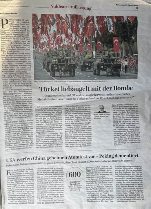 بەپێی ئەم راپۆرتە رۆژنامەوانییەی رۆژنامەی دێر تاگەسشپیگلی ئەڵمانی بێت کە لە لایەن خاتوو سۆزانە گوستەن نووسراوە، تورکیا لە بێدەنگییەکی سەیردا دەخوازێ و خەریکە چەکی ئەتۆمی دروست بکات.